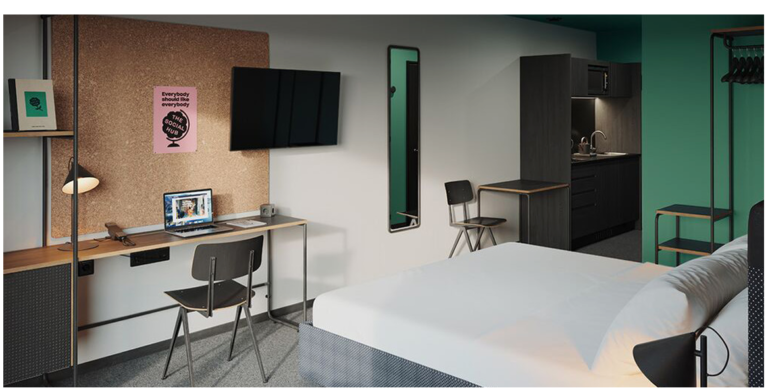 • Acomodação confortável em residência estudantil com quarto e banheiro privativos, garantindo sua privacidade e bem-estar.